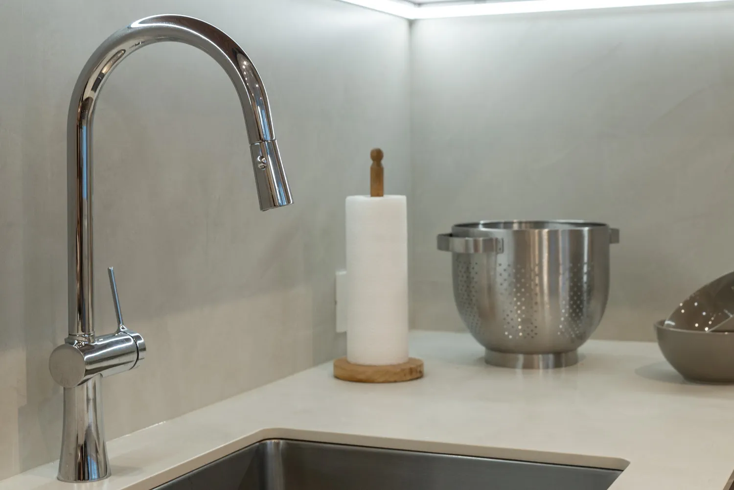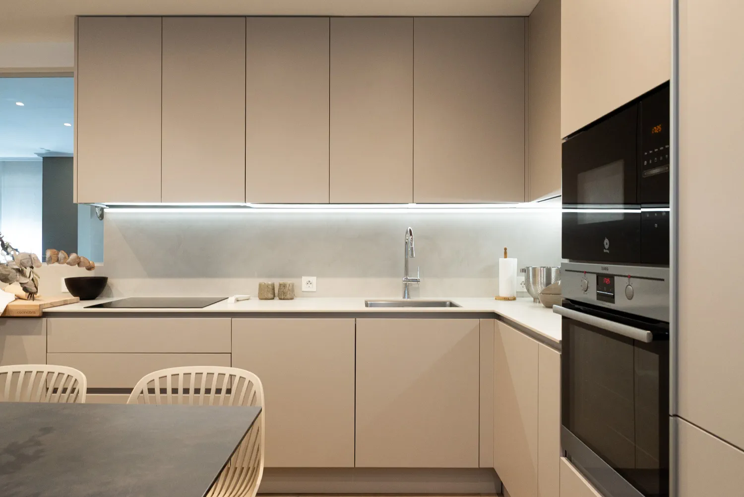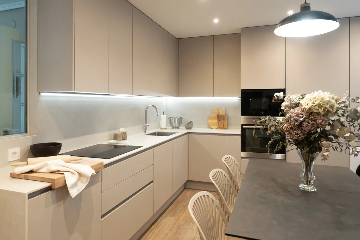 La zona principal de trabajo se organiza con una encimera en L, pensada para disponer de una superficie cómoda y continua, sin perder de vista que en esta cocina prima el almacenaje. La encimera se realiza en Dekton Albarium, un porcelánico de tono claro con un veteado suave y natural, resistente y muy adecuado para el uso diario. Se combina con muebles altos hasta el techo en acabado super mate Terra. Estos aportan uniformidad, orden y una gran capacidad para guardar todo lo necesario, sin renunciar a la estética. En esta zona se integran la placa de inducción y la zona de aguas, con iluminación LED bajo mueble que mejora la visibilidad y hace más cómodo el trabajo en cocina.