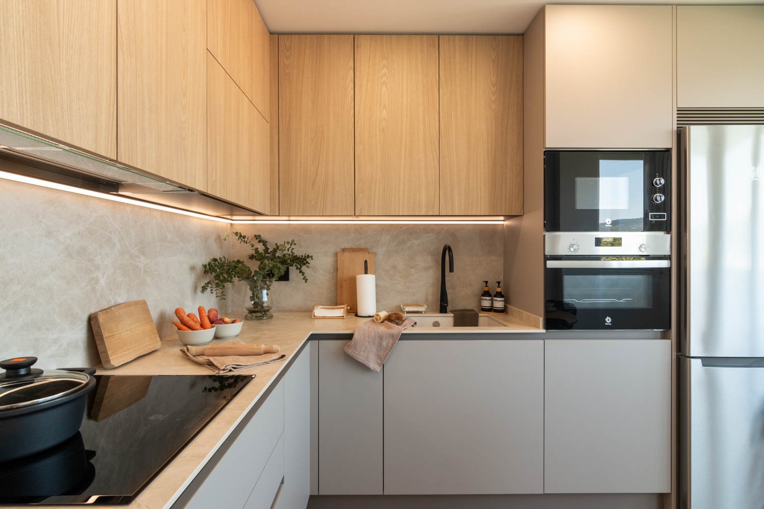 Además del mobiliario y los acabados, nos ocupamos del equipamiento: electrodomésticos integrados, grifería, fregaderos, sistemas de reciclaje y soluciones de almacenaje que optimizan cada rincón. Buscamos que todo encaje de forma natural, creando una cocina equilibrada y pensada para durar muchos años.